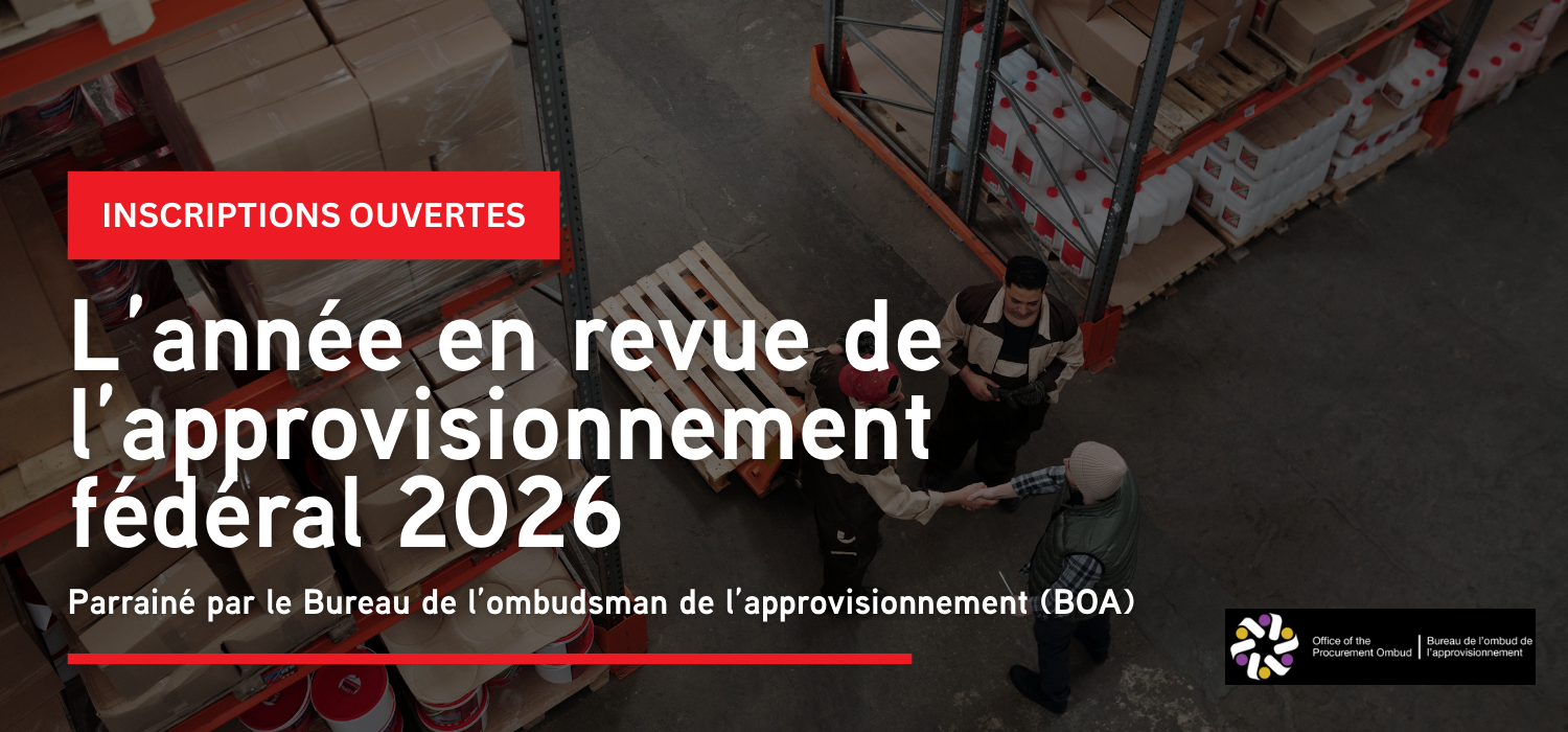 Notamment, la séance soulignera les 10 principaux problèmes observés en approvisionnement fédéral, le travail du bureau au cours de l’année et les conclusions qui ont découlé de nouveau rapport de recherche intitulé « L’heure est aux solutions : Cinq principaux changements fondamentaux nécessaires dans l’approvisionnement fédéral »